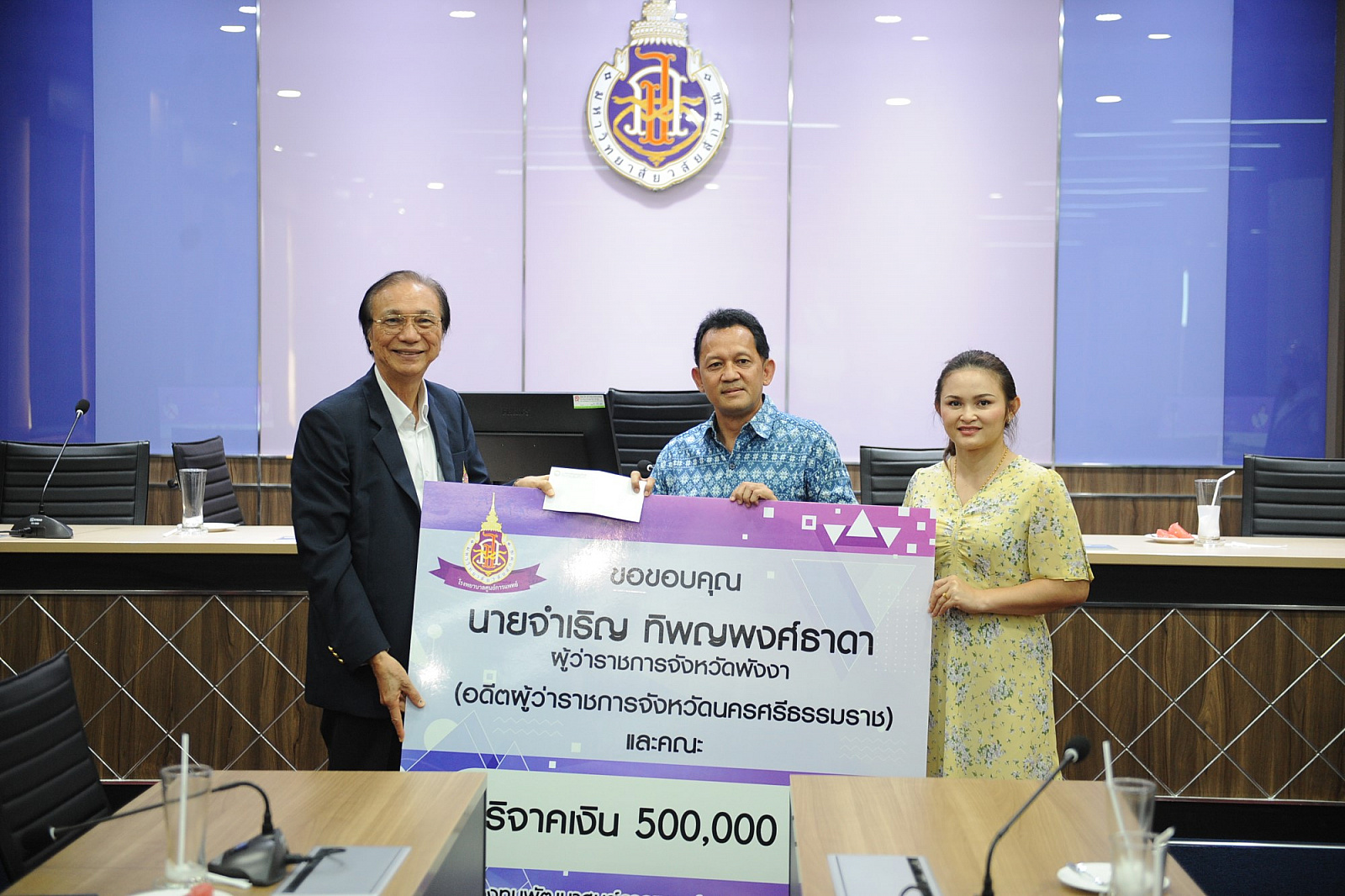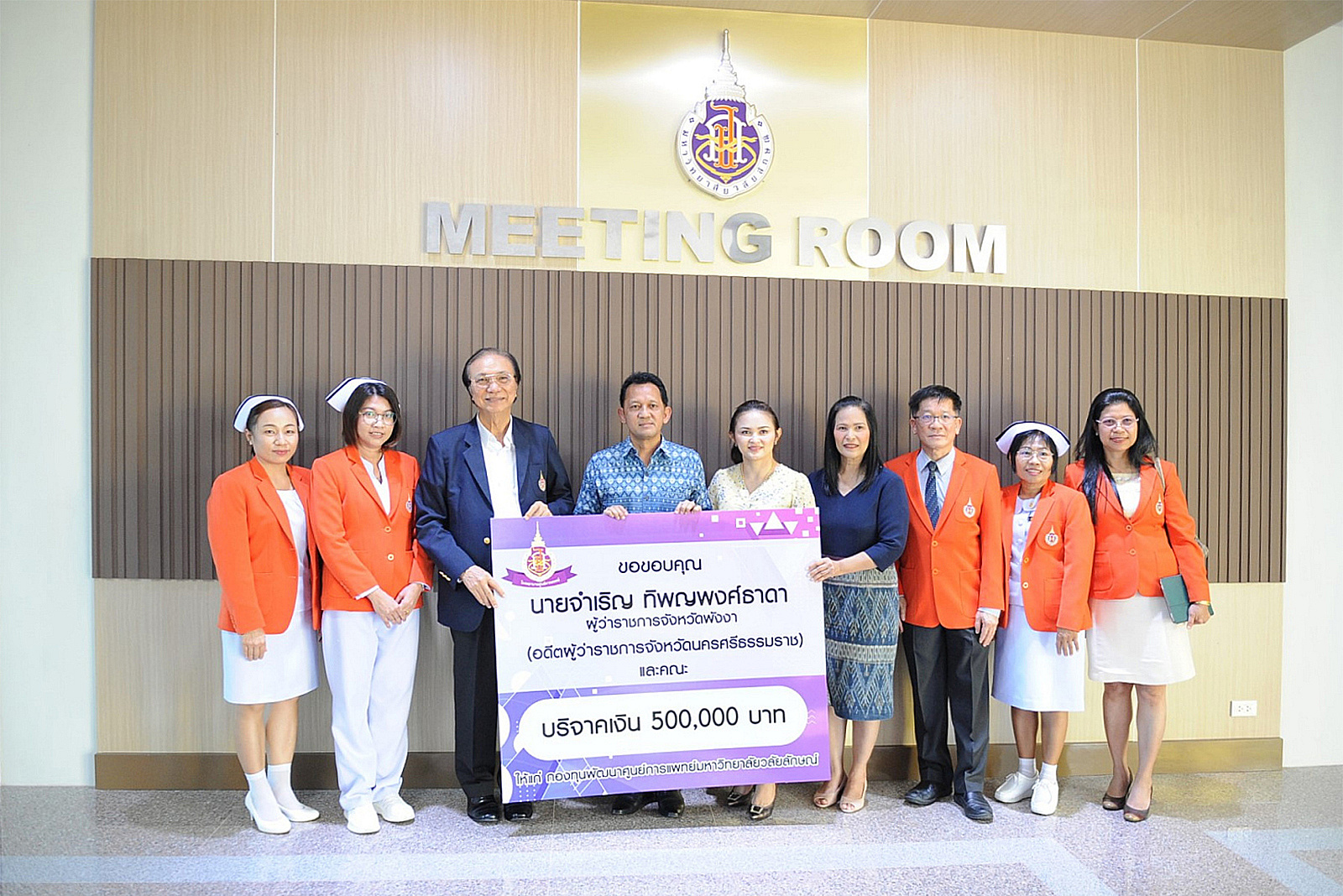 นายจำเริญ ทิพญพงศ์ธาดา ผู้ว่าราชการจังหวัดพังงา(อดีตผู้ว่าราชการจังหวัดนครศรีธรรมราช)และคณะ มอบเงินบริจาคสมทบกองทุนพัฒนาโรงพยาบาลศูนย์การแพทย์ม.วลัยลักษณ์ จำนวน 5 แสนบาท