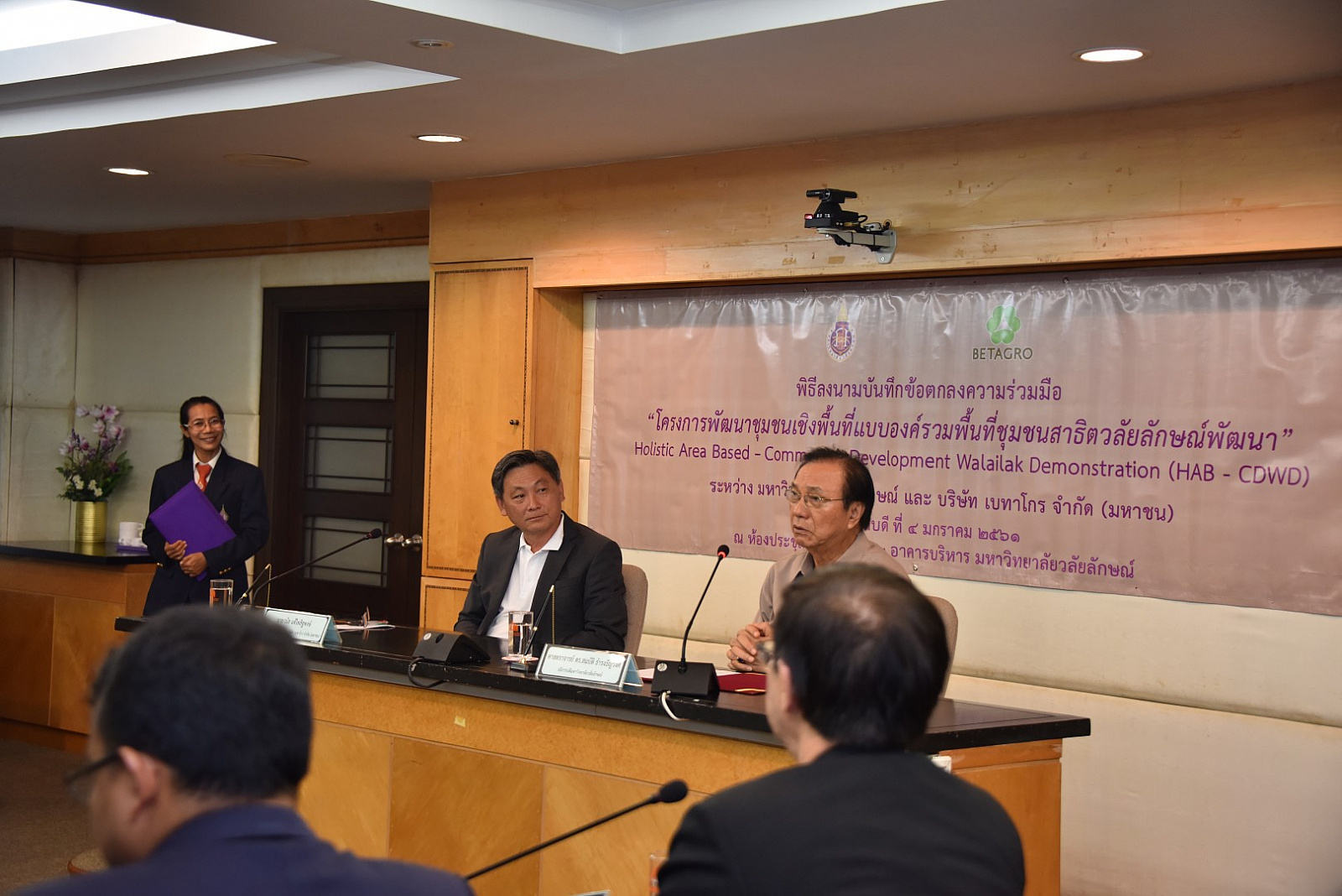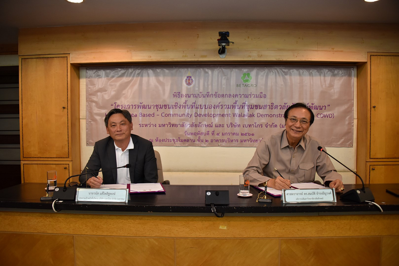 เมื่อวันที่ 4 มกราคม 2560 ที่ผ่านมา ณ ห้องประชุมโมคลาน อาคารบริหาร ม.วลัยลักษณ์ ศาสตราจารย์ ดร. สมบัติ ธำรงธัญวงศ์ อธิการบดี ม.วลัยลักษณ์ และ นายวนัส แต้ไพสิฐพงษ์ ประธานเจ้าหน้าที่บริหารบริษัท เบทาโกร จำกัด (มหาชน) ลงนามในบันทึกข้อตกลงความร่วมมือ ว่าด้วยโครงการพัฒนาชุมชนเชิงพื้นที่แบบองค์รวมพื้นที่ชุมชนสาธิตวลัยลักษณ์พัฒนา Holistic Area Based – Community Development Walailak Demonstration (HAB – CDWD) ระหว่าง ม.วลัยลักษณ์ กับ บริษัท เบทาโกร จำกัด (มหาชน) เพื่อพัฒนางานด้านการจัดทำโครงการบริการวิชาการแก่สังคมและการบริหารจัดการโครงการ เป็นการแลกเปลี่ยนเรียนรู้ ขยายผลงานทางด้านบริการแก่สังคมของมหาวิทยาลัยและบริษัท เบทาโกร จำกัด (มหาชน)ไปสู่ชุมชน ตลอดจนเพื่อพัฒนาศักยภาพของบุคลากรทั้งสองฝ่าย โดยมี ศาสตราจารย์ นายสัตวแพทย์ ดร.อภินันท์ สุประเสริฐ รองอธิการบดีฝ่ายวิจัยและบริการสังคม ผู้ช่วยศาสตราจารย์ ดร.อมรศักดิ์ สวัสดี รักษาการแทนผู้อำนวยการศูนย์บริการวิชาการ นายจักริน แต้ไพสิฐพงษ์ รองกรรมการผู้จัดการใหญ่อาวุโส บริษัท เบทาโกร จำกัด (มหาชน) และนายบัญญัติ คำบุญเหลือ ผู้อำนวยการกิจกรรมเพื่อสังคม หน่วยงานกิจกรรมเพื่อสังคม สำนักพัฒนาความยั่งยืน เครือเบทาโกร ลงนามเป็นพยาน ตลอดจนคณะผู้แทนจากบริษัท เบทาโกร จำกัด (มหาชน) ผู้บริหารและคณาจารย์ ม.วลัยลักษณ์ ร่วมพิธีลงนาม