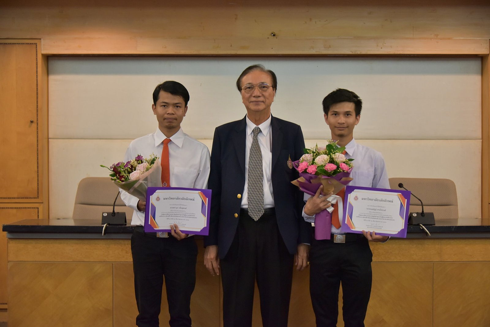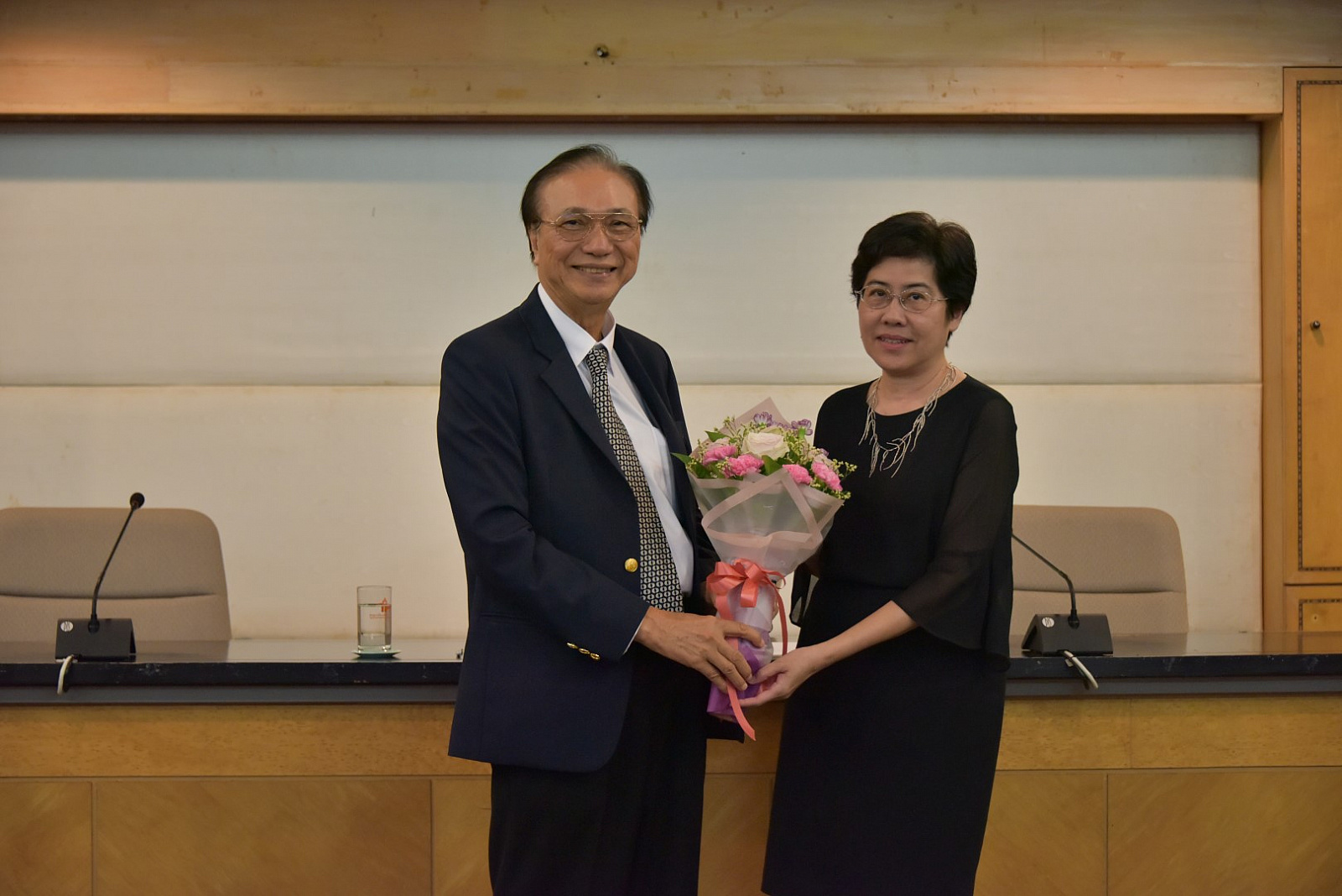 อธิการบดีมอบช่อดอกไม้แสดงความยินดีแก่ คณาจารย์ บุคลากรและนักศึกษาในพิธีก่อนวาระการประชุมบริหาร