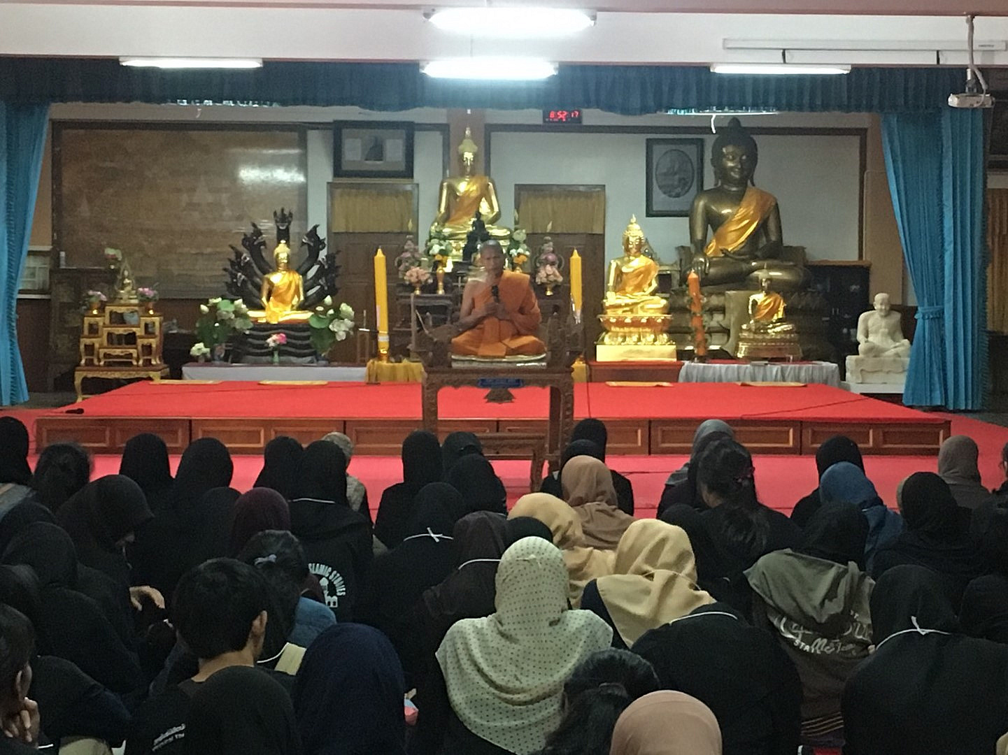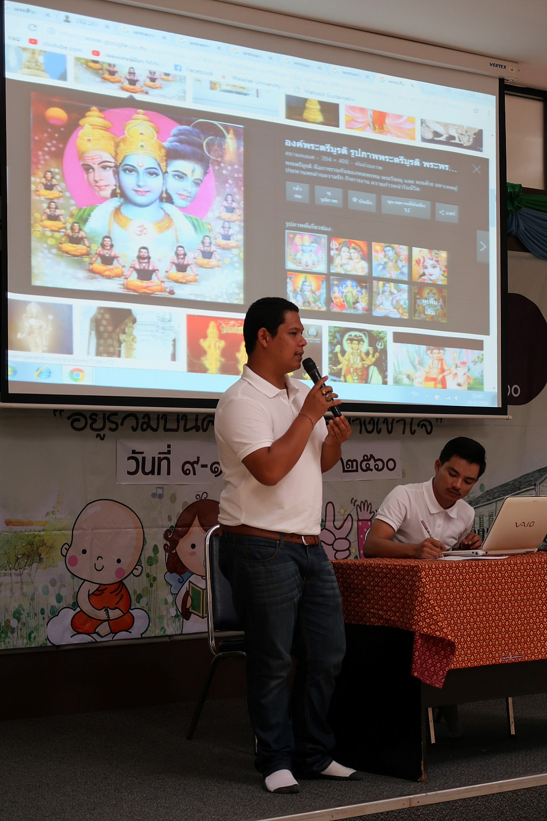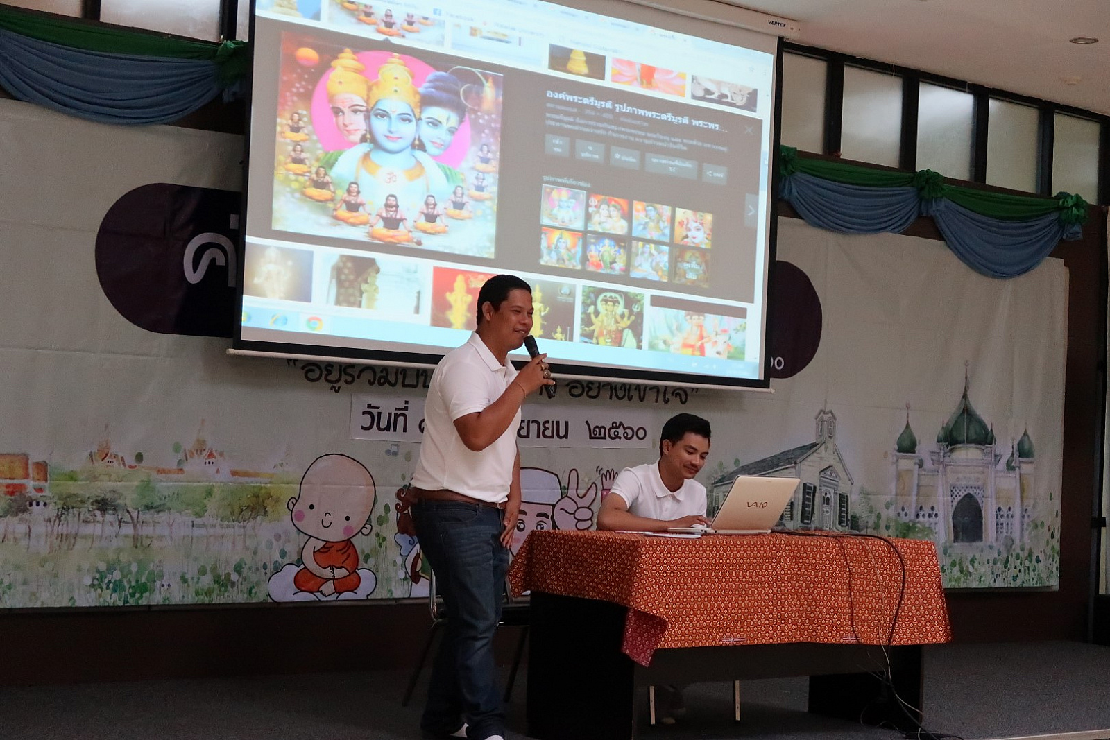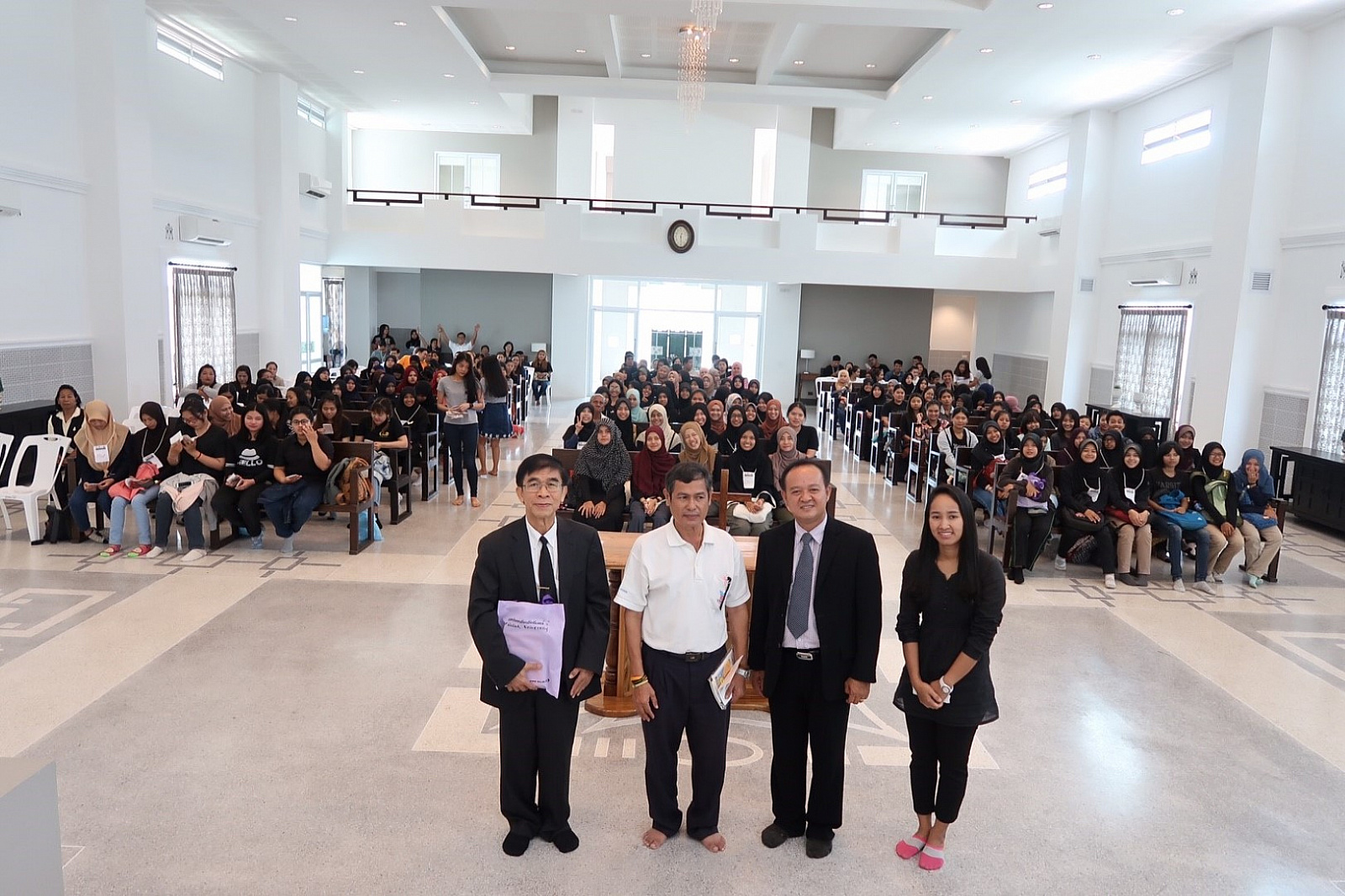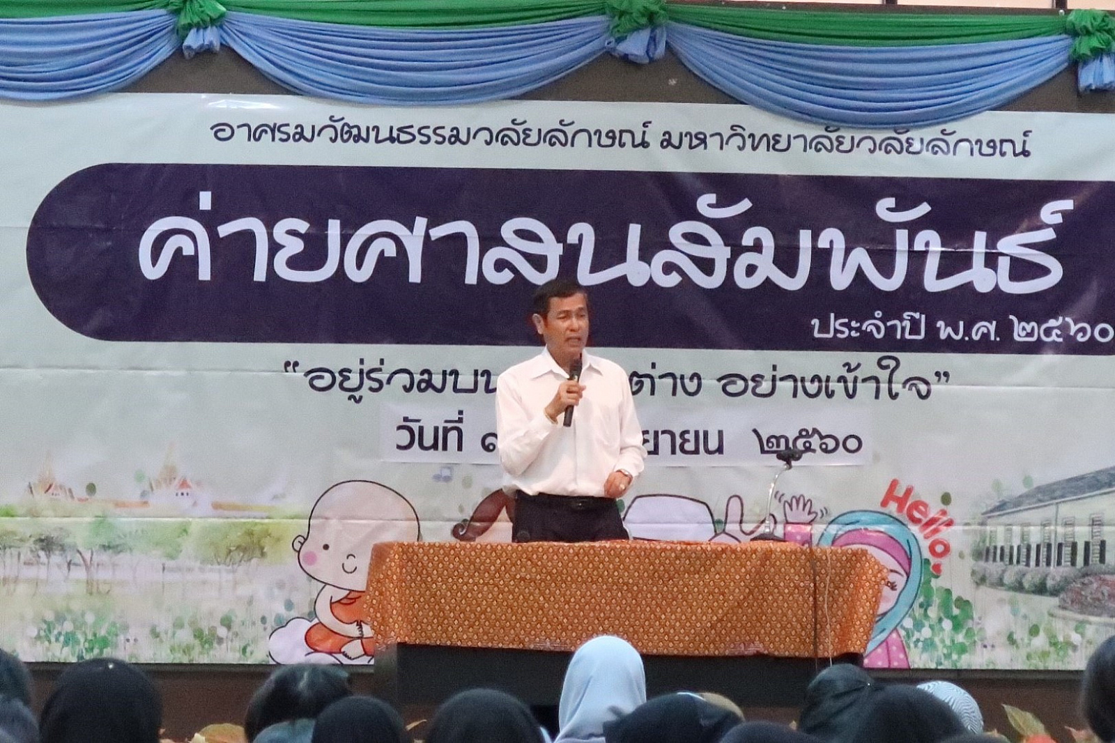 เมื่อวันที่ ๙-๑๐ กันยายน ๒๕๖๐ นักศึกษามหาวิทยาลัยวลัยลักษณ์ กว่า ๑๔๐ คน เข้าร่วมกิจกรรม “ค่ายศาสนสัมพันธ์” ประจำปี ๒๕๖๐ ภายใต้กรอบคิดของโครงการ “อยู่ร่วมบนความต่าง อย่างเข้าใจ” เพื่อให้นักศึกษาได้ตระหนักถึงความสำคัญในการนำหลักธรรมคำสอนของศาสนาต่างๆ พร้อมเปิดใจเรียนรู้และสร้างความเข้าใจบนความแตกต่างของศาสนา อันจะนำไปสู่การประยุกต์ใช้ในการดำเนินชีวิตได้อย่างถูกต้องและสามารถดำรงอยู่ในสังคมได้อย่างมีความสุข โดยเรียนรู้ผ่าน ๕ ฐานการเรียนรู้ ดังนี้ ฐานการเรียนรู้ที่ ๑ “จุดร่วม ๔ ศาสนา” บรรยายโดย รศ.ดร.สืบพงศ์ ธรรมชาติ รักษาการแทนผู้อำนวยการอาศรมวัฒนธรรมวลัยลักษณ์ ฐานการเรียนรู้ที่ ๒ “เข้าใจเรา เข้าใจเพื่อนชาวมุสลิม” ณ มัสยิดบ้านกลาง ต.โพธิ์ทอง อ.ท่าศาลา จังหวัดนครศรีธรรมราช โดยวิทยากร คุณเกาะเดช สัมฤทธิ์ ครูสอนศาสนา ฐานการเรียนรู้ที่ ๓ “เข้าใจเรา เข้าใจเพื่อนชาวพุทธ”ณ วัดพระมหาธาตุวรมหาวิหาร จังหวัดนครศรีธรรมราช โดยวิทยากร พระครูพิศิษฎ์คณาทร ดร. ฐานการเรียนรู้ที่ ๔ “เข้าใจเรา เข้าใจเพื่อนชาวคริสต์” ณ คริสตจักรพระกิตติคุณสมบูรณ์นครศรีธรรมราช โดยวิทยากร ท่าน ศาสนาจารย์สุริยัน เทพเเก้ว ศิษยาภิบาลคริสตจักรพระกิตติคุณสมบูรณ์นครศรีธรรมราช ฐานการเรียนรู้ ๕ “เข้าใจพราหมณ์ ผ่านพิธีกรรมและความหมาย” ณ ฐานพระสยม อำเภอเมือง จังหวัดนครศรีธรรมราช โดยวิทยากร คุณพลชัย จันทร์เกิด