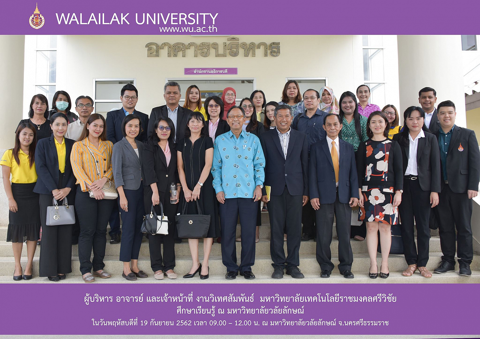 ผู้บริหาร อาจารย์ และเจ้าหน้าที่ งานวิเทศสัมพันธ์ มหาวิทยาลัยเทคโนโลยีราชมงคลศรีวิชัย จ.สงขลา จ.ตรัง และ จ.นครศรีธรรมราช ศึกษาเรียนรู้ งานวิเทศสัมพันธ์และงานภาษาต่างประเทศ สำนักวิชาศิลปศาสตร์ มหาวิทยาลัยวลัยลักษณ์