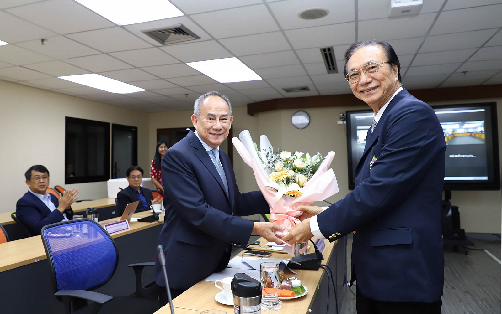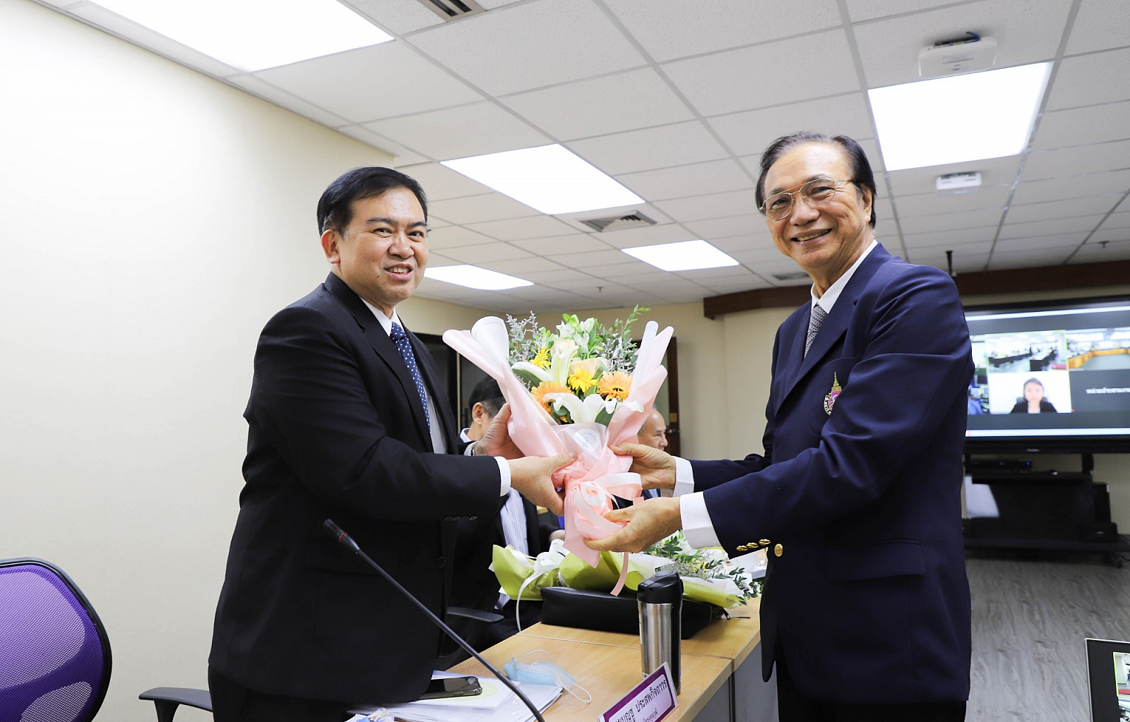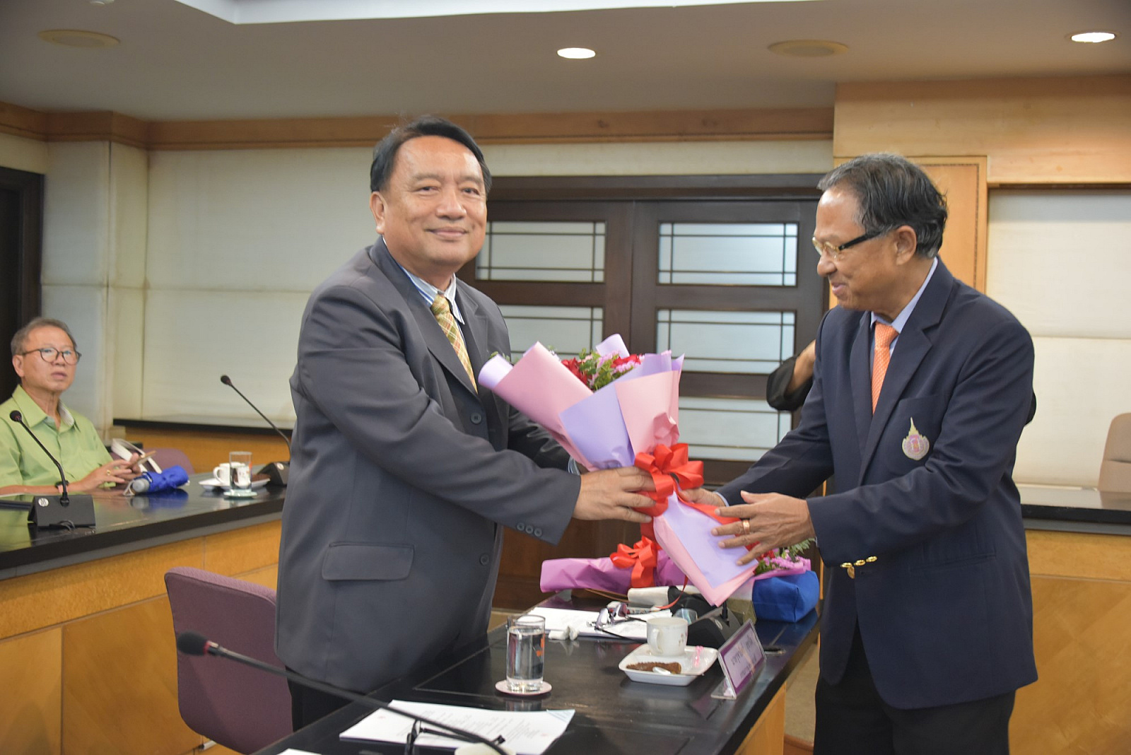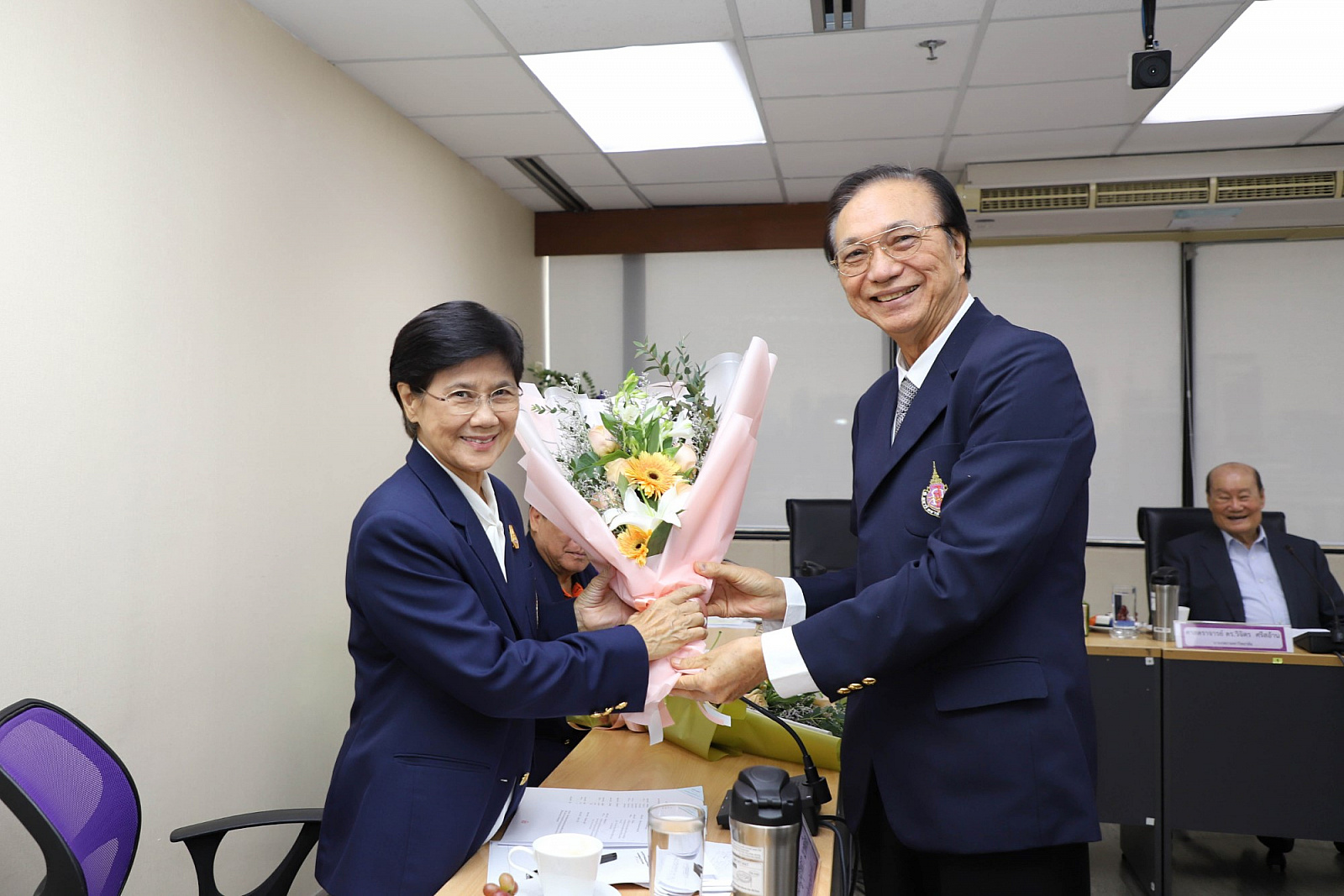 อธิการบดีมอบช่อดอกไม้แสดงความยินดีแก่กรรมการสภามหาวิทยาลัยผู้ทรงคุณวุฒิ