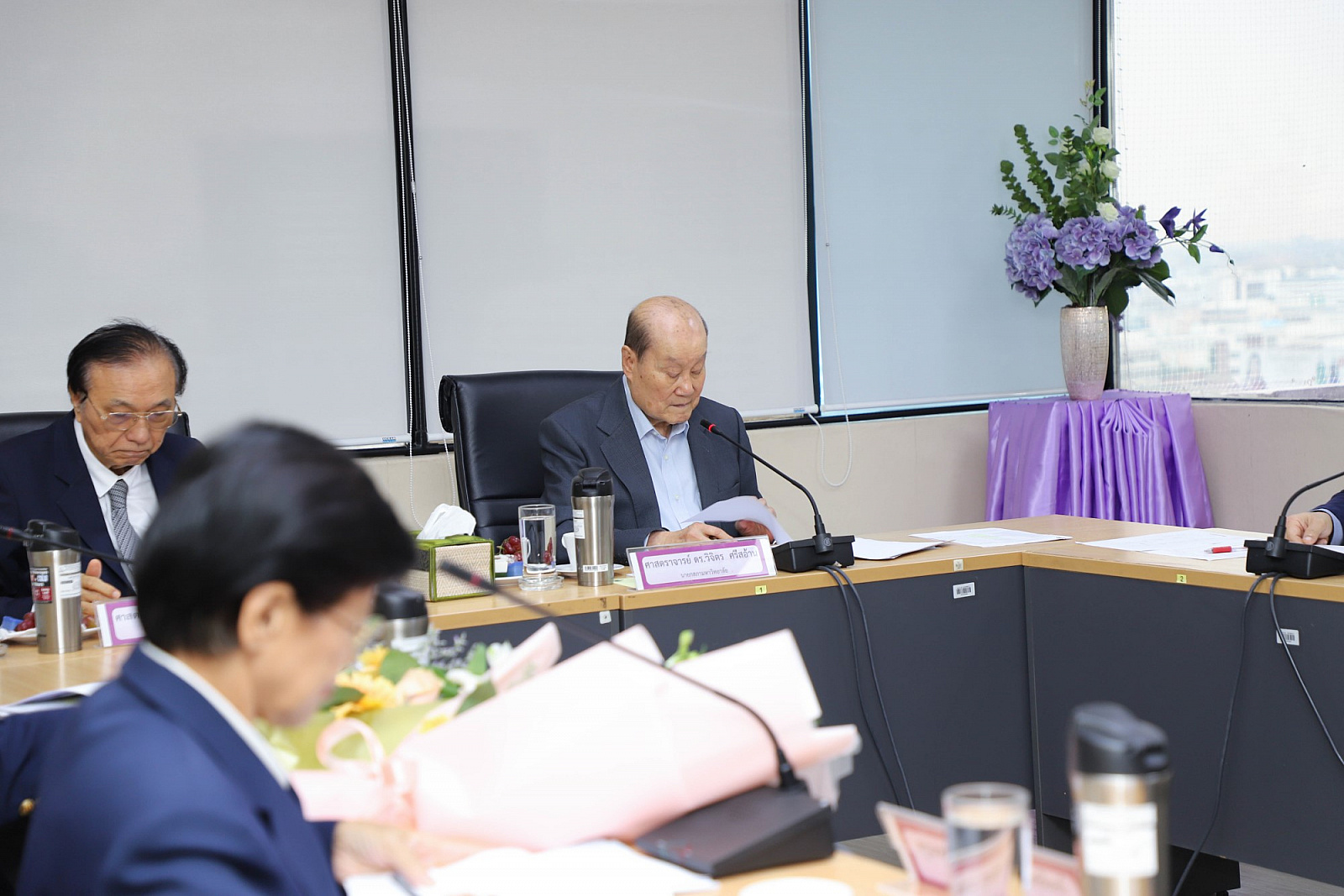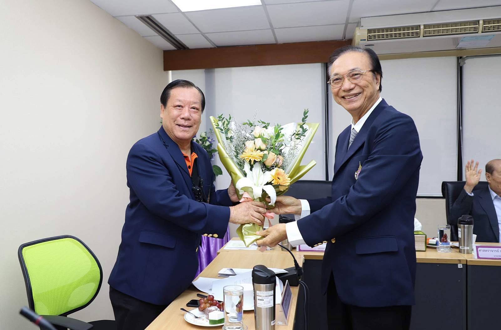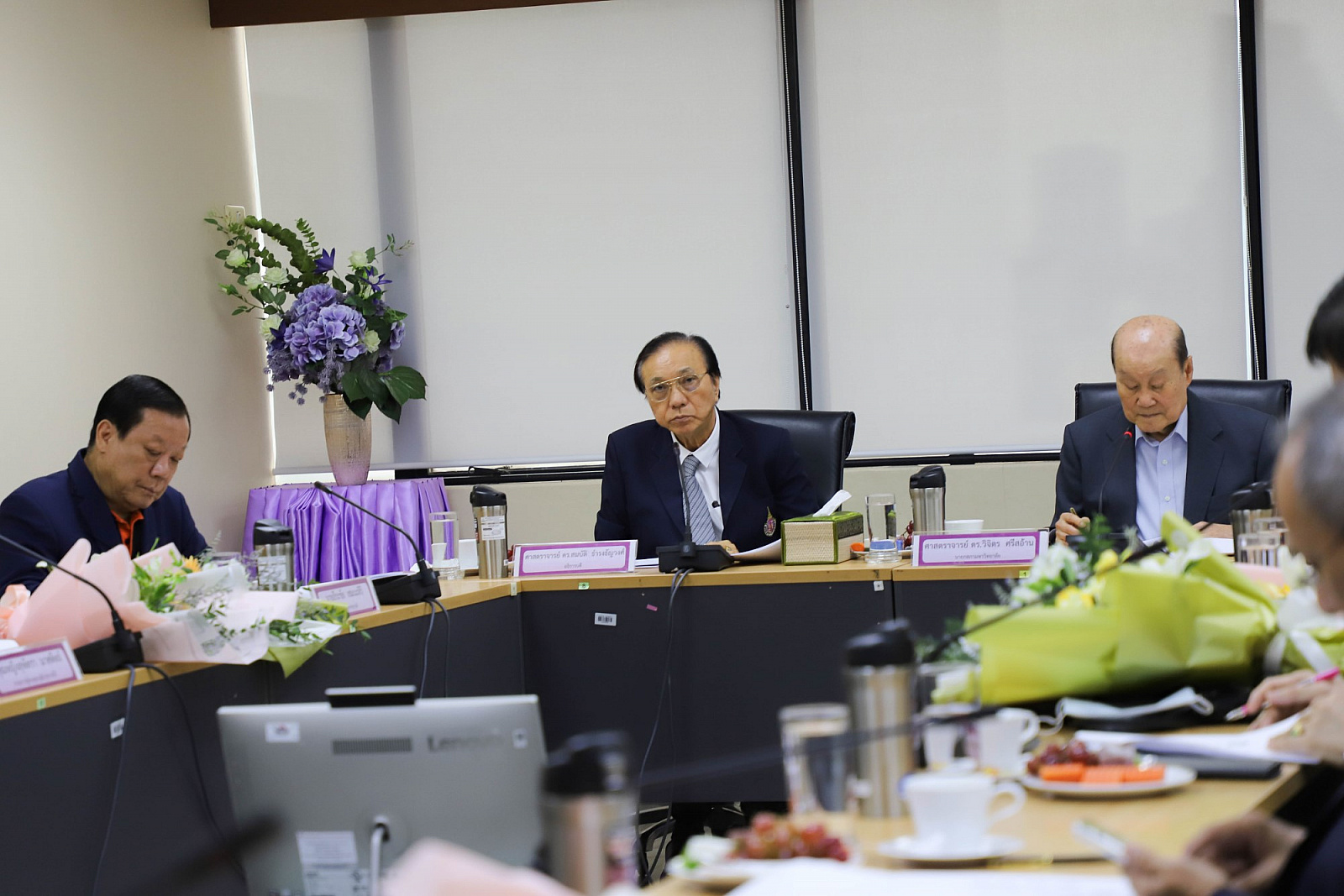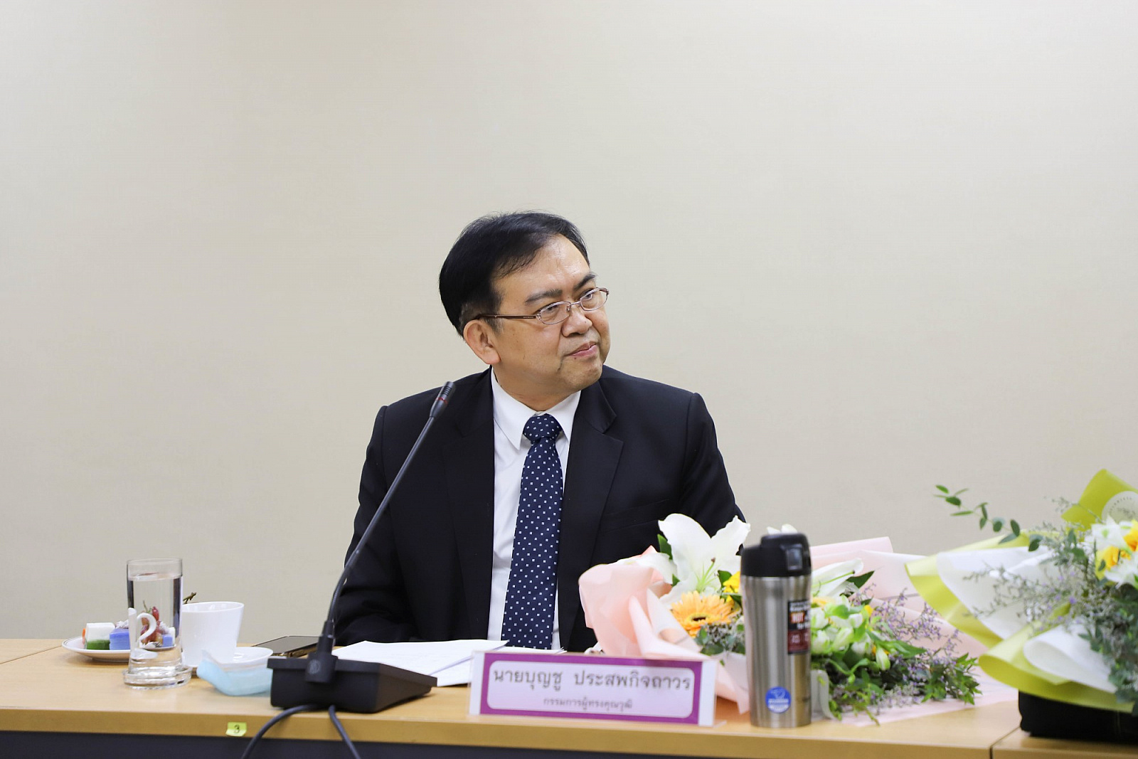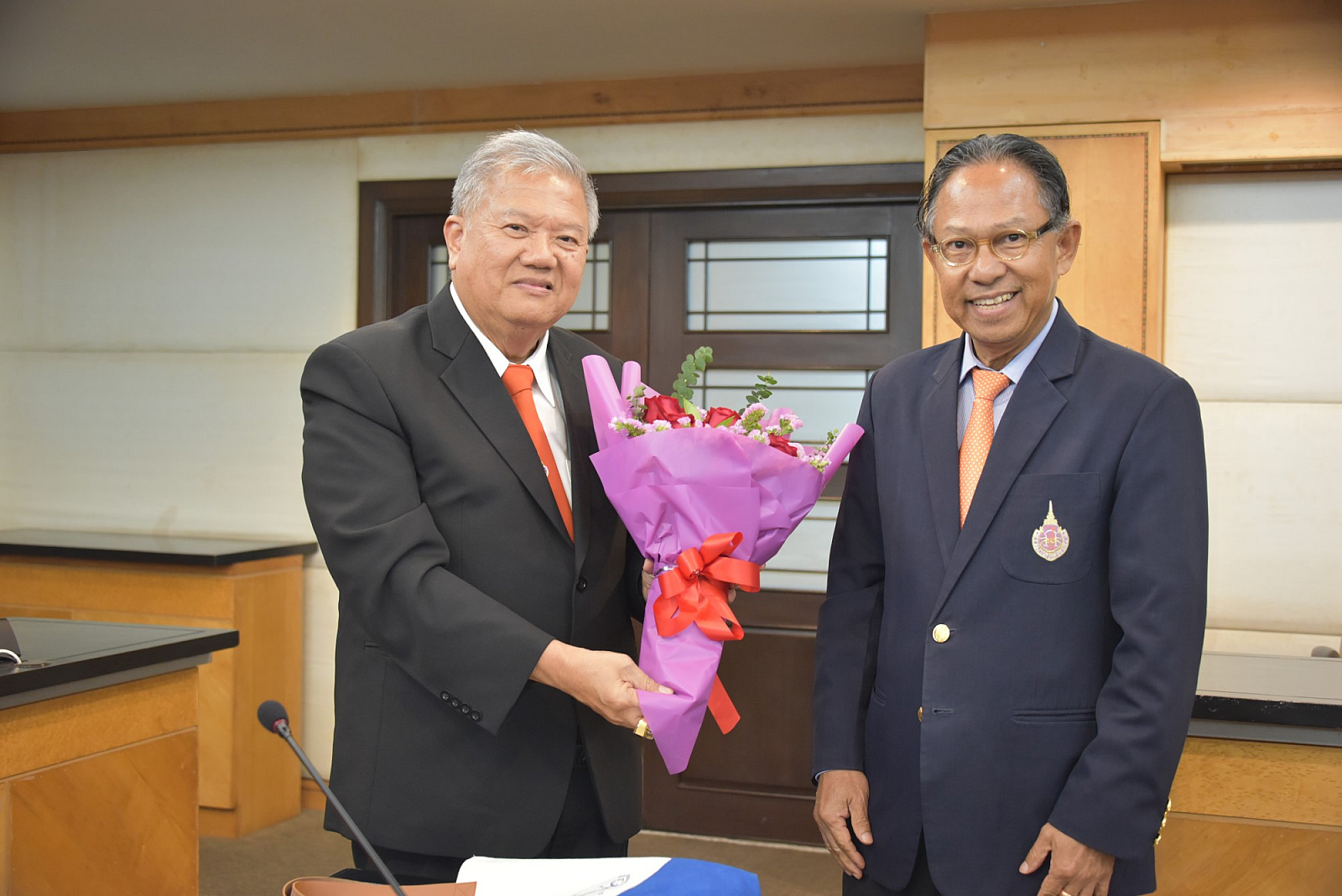 อธิการบดีมอบช่อดอกไม้แสดงความยินดีแก่กรรมการสภามหาวิทยาลัยผู้ทรงคุณวุฒิ