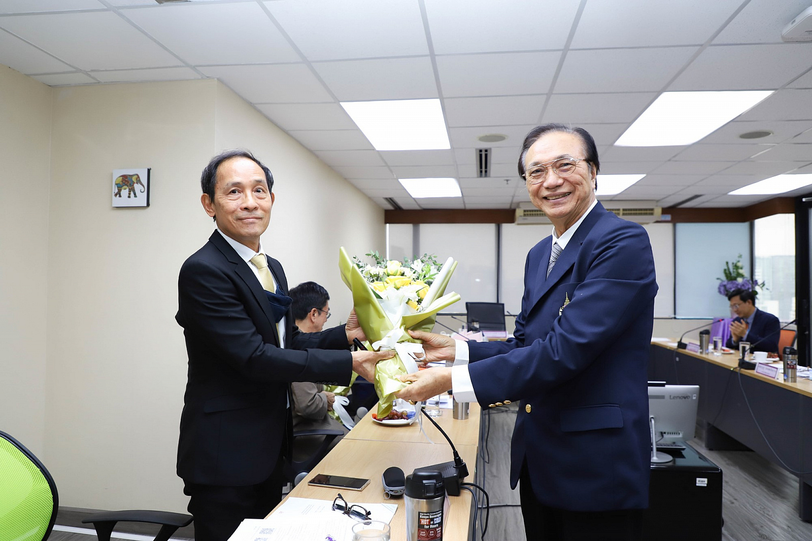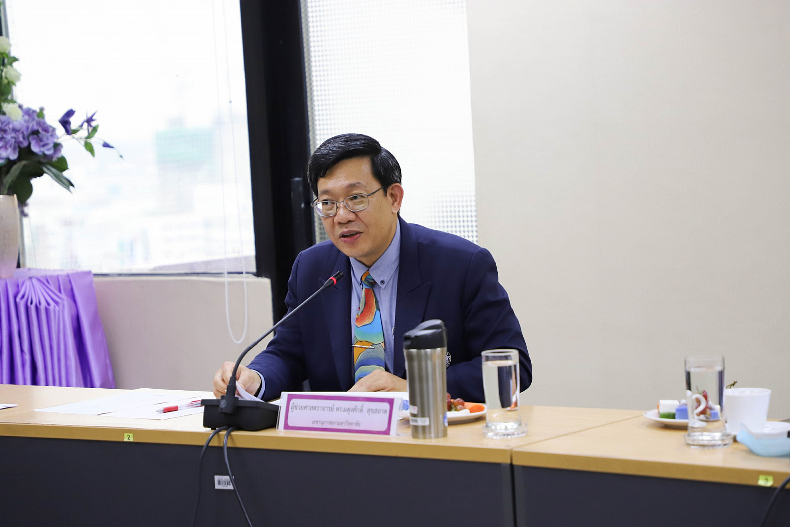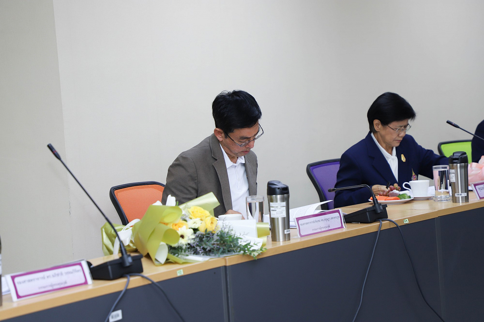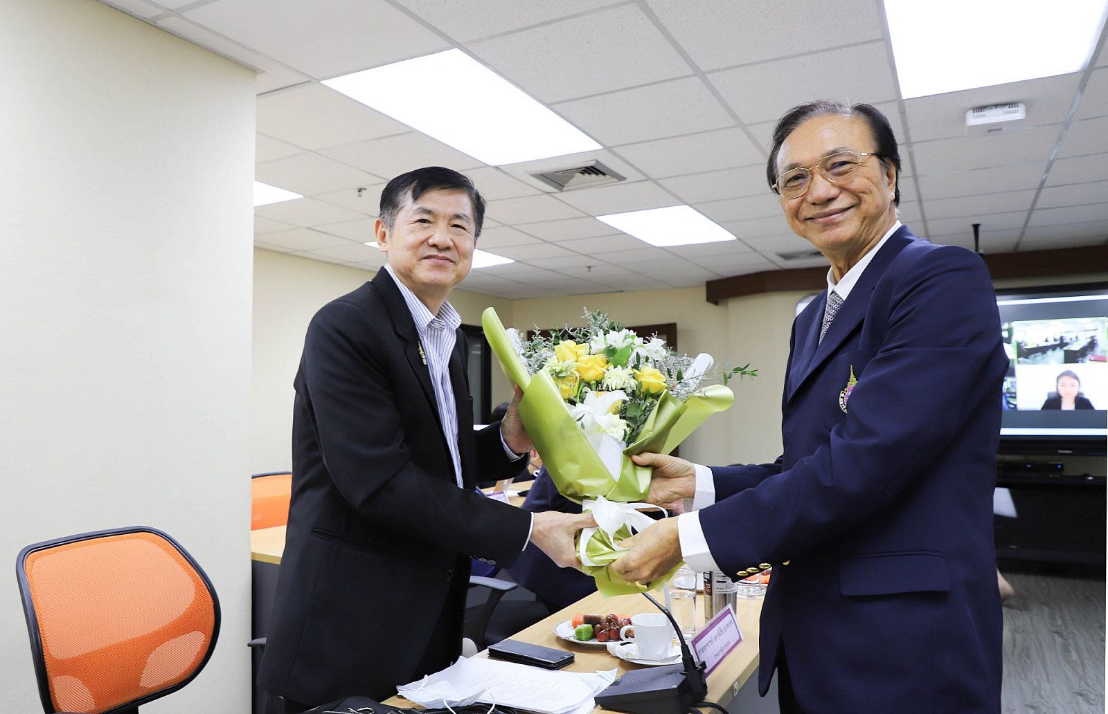 อธิการบดีมอบช่อดอกไม้แสดงความยินดีแก่กรรมการสภามหาวิทยาลัยผู้ทรงคุณวุฒิ