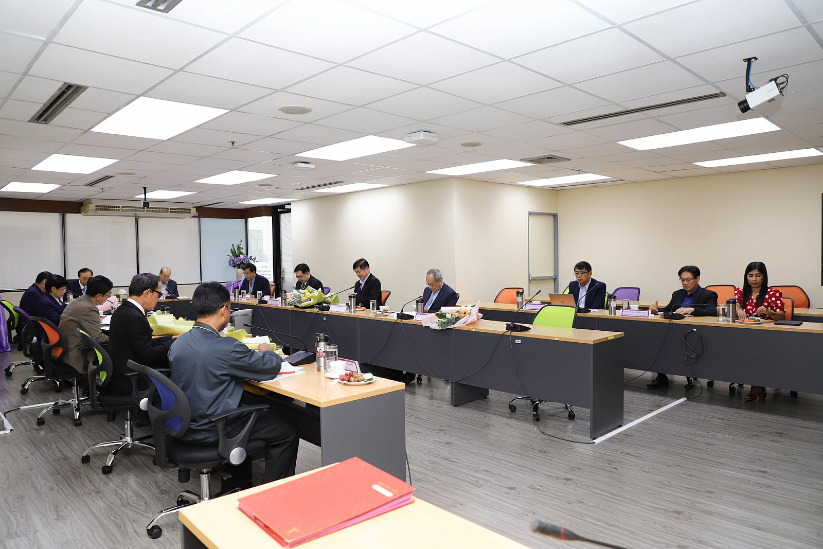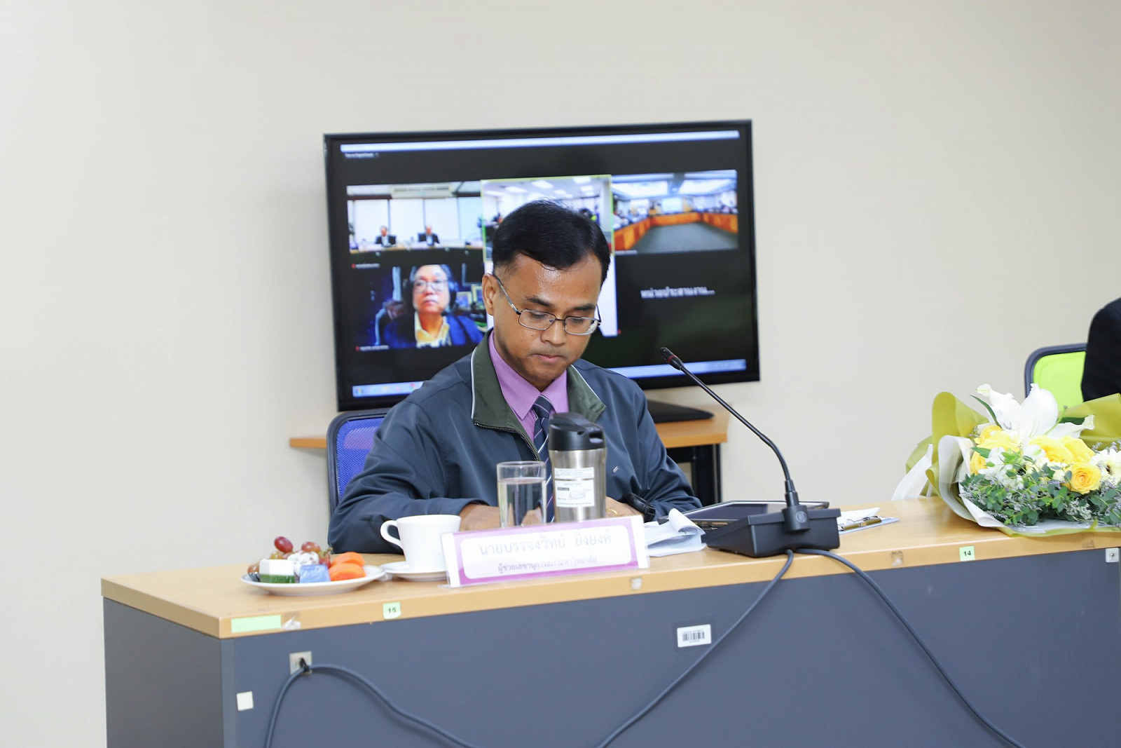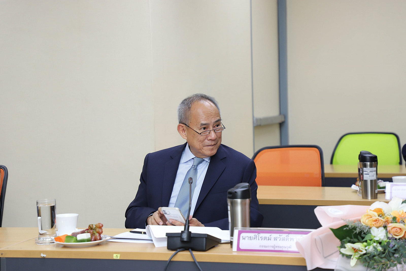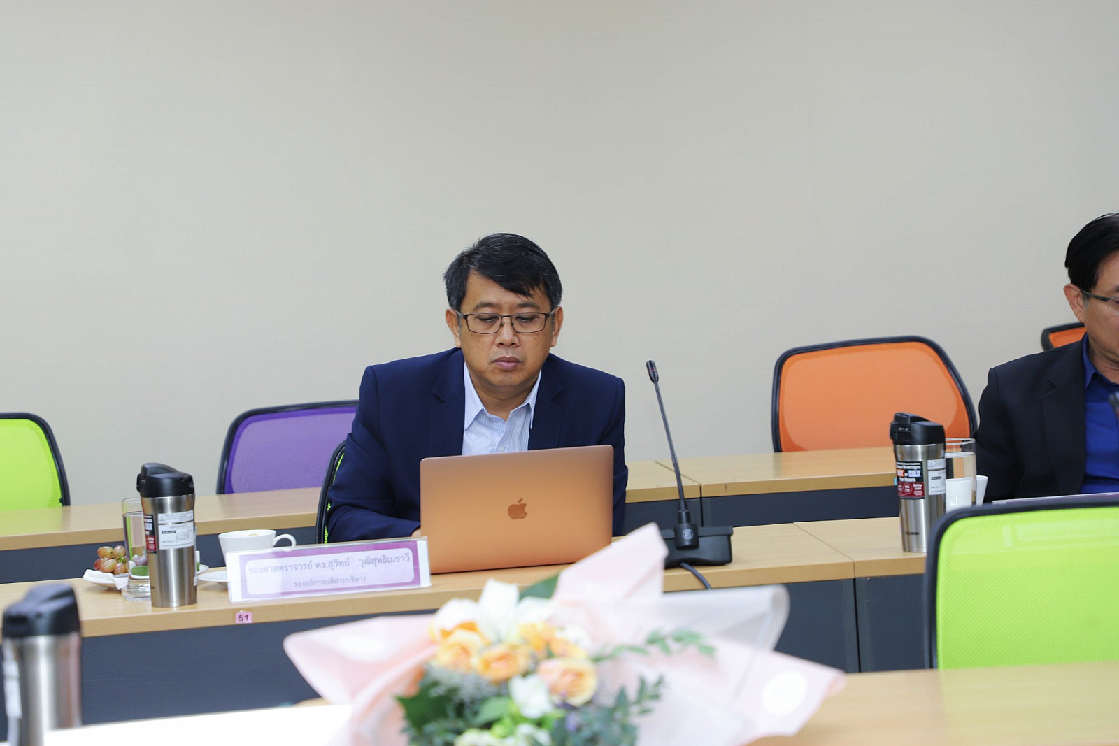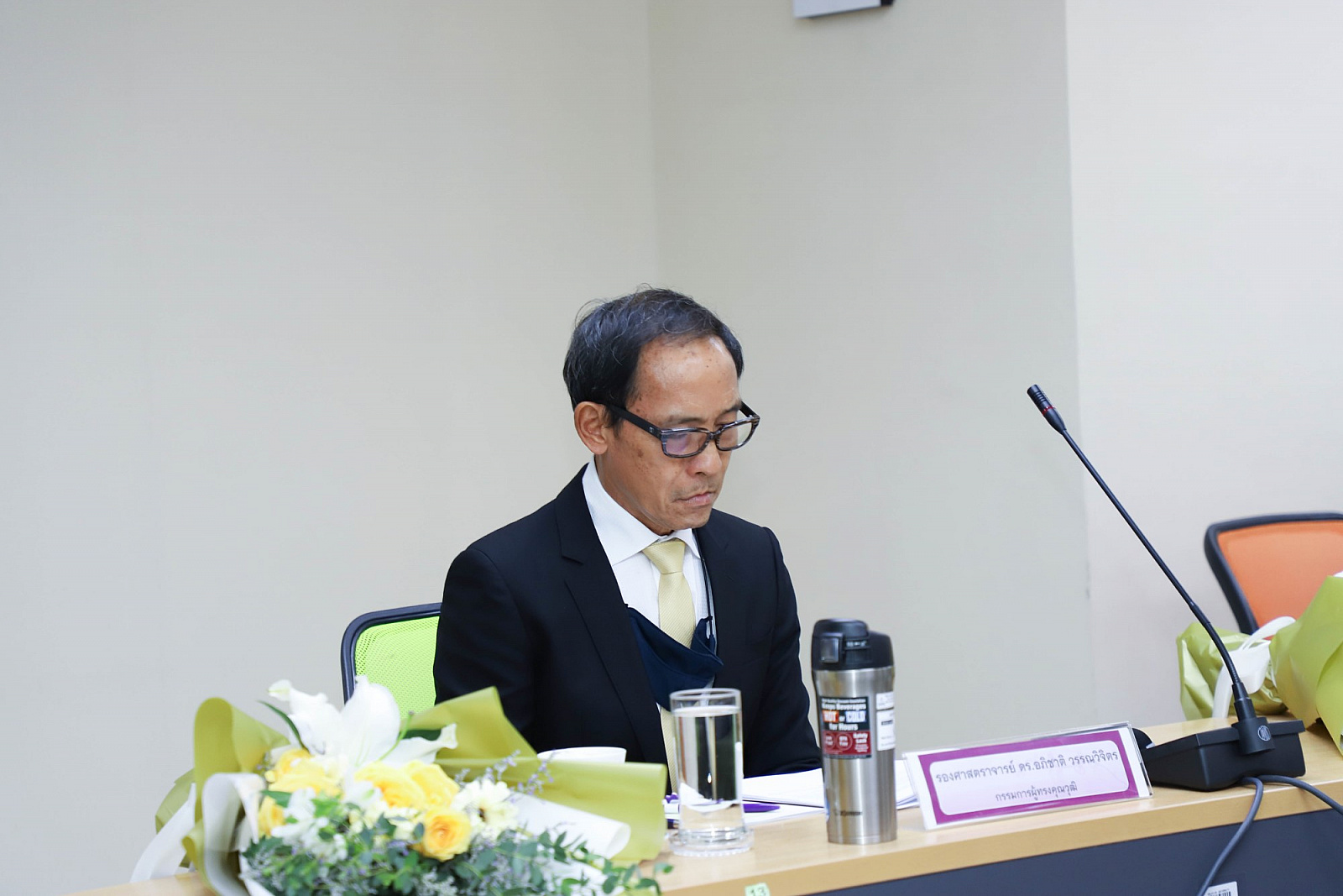 อธิการบดีมอบช่อดอกไม้แสดงความยินดีแก่กรรมการสภามหาวิทยาลัยผู้ทรงคุณวุฒิ