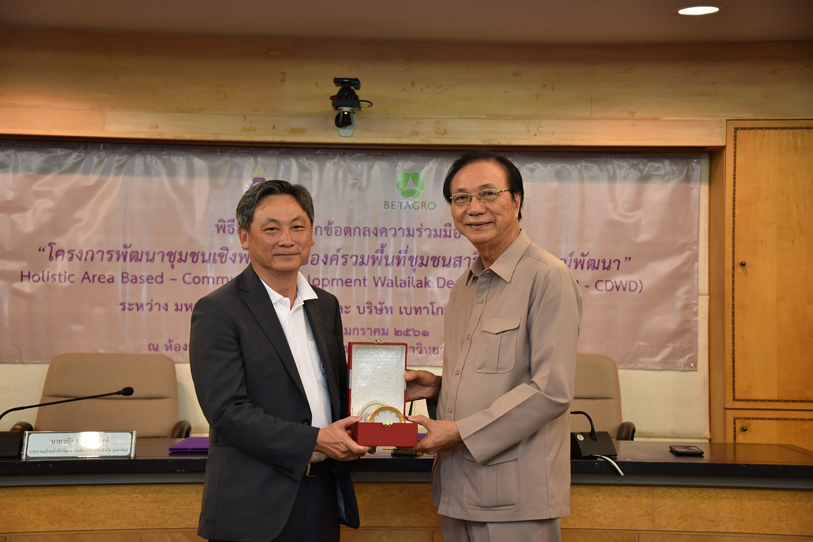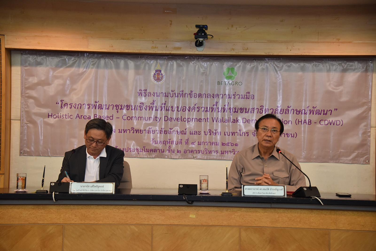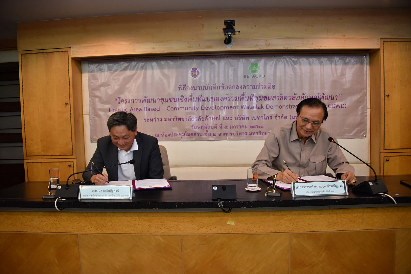 เมื่อวันที่ 4 มกราคม 2560 ที่ผ่านมา ณ ห้องประชุมโมคลาน อาคารบริหาร ม.วลัยลักษณ์ ศาสตราจารย์ ดร. สมบัติ ธำรงธัญวงศ์ อธิการบดี ม.วลัยลักษณ์ และ นายวนัส แต้ไพสิฐพงษ์ ประธานเจ้าหน้าที่บริหารบริษัท เบทาโกร จำกัด (มหาชน) ลงนามในบันทึกข้อตกลงความร่วมมือ ว่าด้วยโครงการพัฒนาชุมชนเชิงพื้นที่แบบองค์รวมพื้นที่ชุมชนสาธิตวลัยลักษณ์พัฒนา Holistic Area Based – Community Development Walailak Demonstration (HAB – CDWD) ระหว่าง ม.วลัยลักษณ์ กับ บริษัท เบทาโกร จำกัด (มหาชน) เพื่อพัฒนางานด้านการจัดทำโครงการบริการวิชาการแก่สังคมและการบริหารจัดการโครงการ เป็นการแลกเปลี่ยนเรียนรู้ ขยายผลงานทางด้านบริการแก่สังคมของมหาวิทยาลัยและบริษัท เบทาโกร จำกัด (มหาชน)ไปสู่ชุมชน ตลอดจนเพื่อพัฒนาศักยภาพของบุคลากรทั้งสองฝ่าย โดยมี ศาสตราจารย์ นายสัตวแพทย์ ดร.อภินันท์ สุประเสริฐ รองอธิการบดีฝ่ายวิจัยและบริการสังคม ผู้ช่วยศาสตราจารย์ ดร.อมรศักดิ์ สวัสดี รักษาการแทนผู้อำนวยการศูนย์บริการวิชาการ นายจักริน แต้ไพสิฐพงษ์ รองกรรมการผู้จัดการใหญ่อาวุโส บริษัท เบทาโกร จำกัด (มหาชน) และนายบัญญัติ คำบุญเหลือ ผู้อำนวยการกิจกรรมเพื่อสังคม หน่วยงานกิจกรรมเพื่อสังคม สำนักพัฒนาความยั่งยืน เครือเบทาโกร ลงนามเป็นพยาน ตลอดจนคณะผู้แทนจากบริษัท เบทาโกร จำกัด (มหาชน) ผู้บริหารและคณาจารย์ ม.วลัยลักษณ์ ร่วมพิธีลงนาม