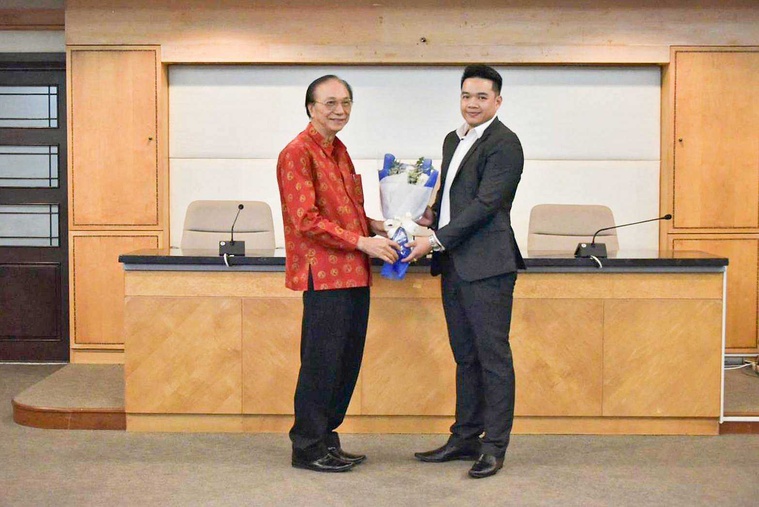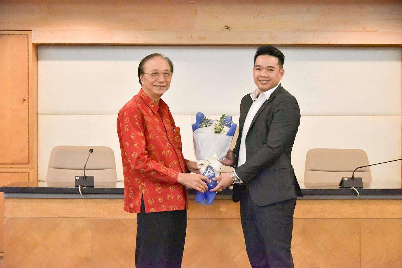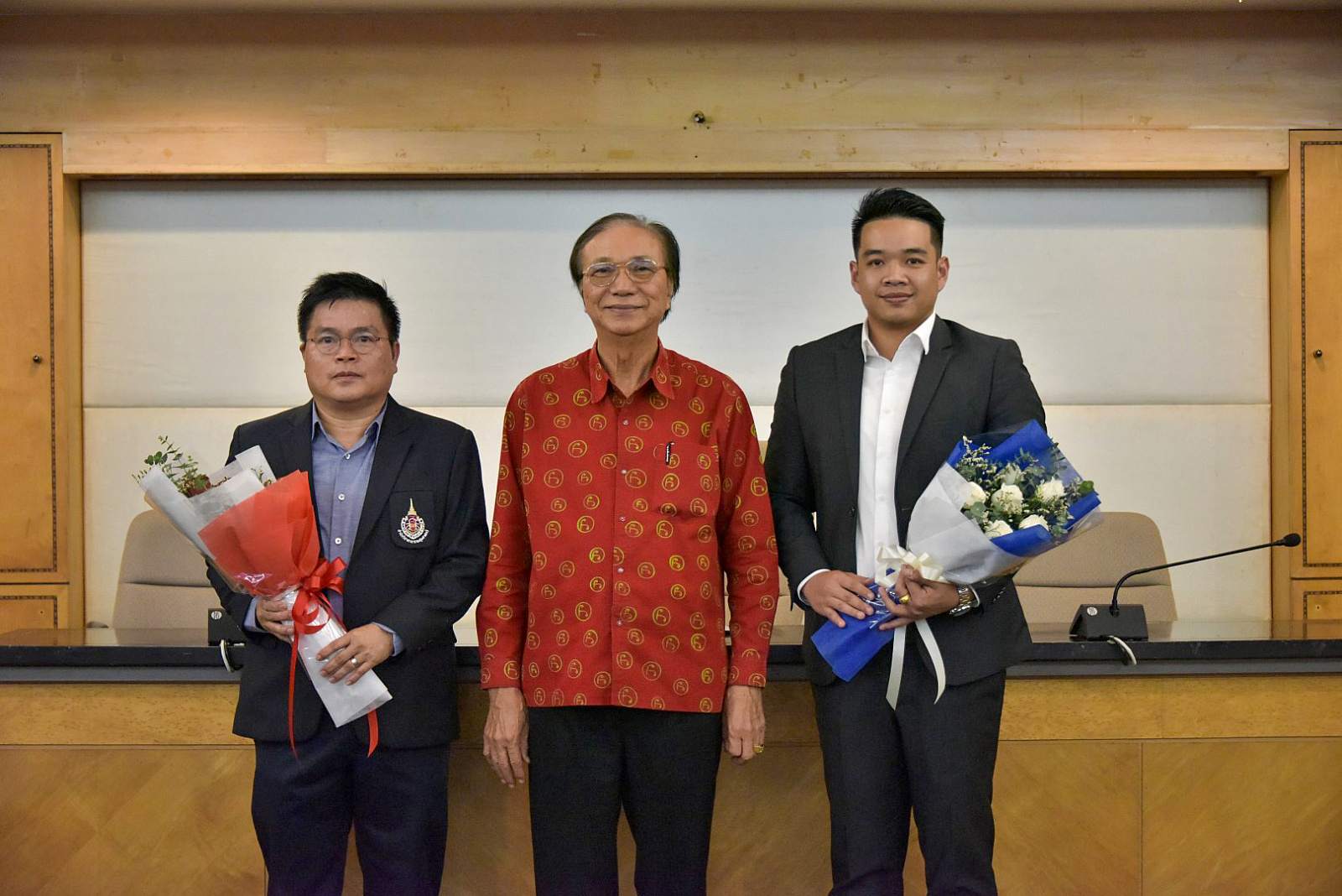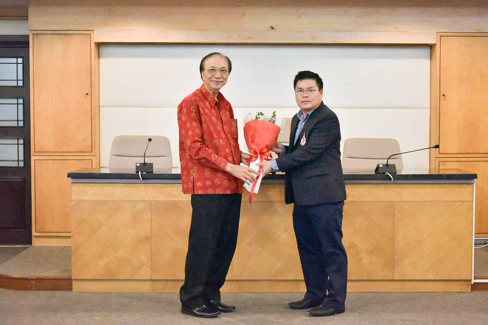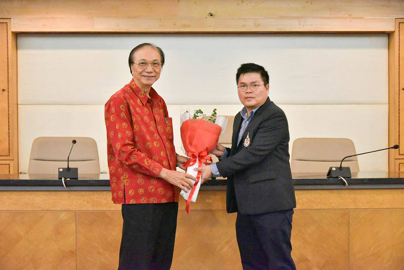 อธิการบดีมอบช่อดอกไม้แสดงความยินดีแก่ผู้ได้รับแต่งตั้งดำรงตำแหน่งทางวิชาการ