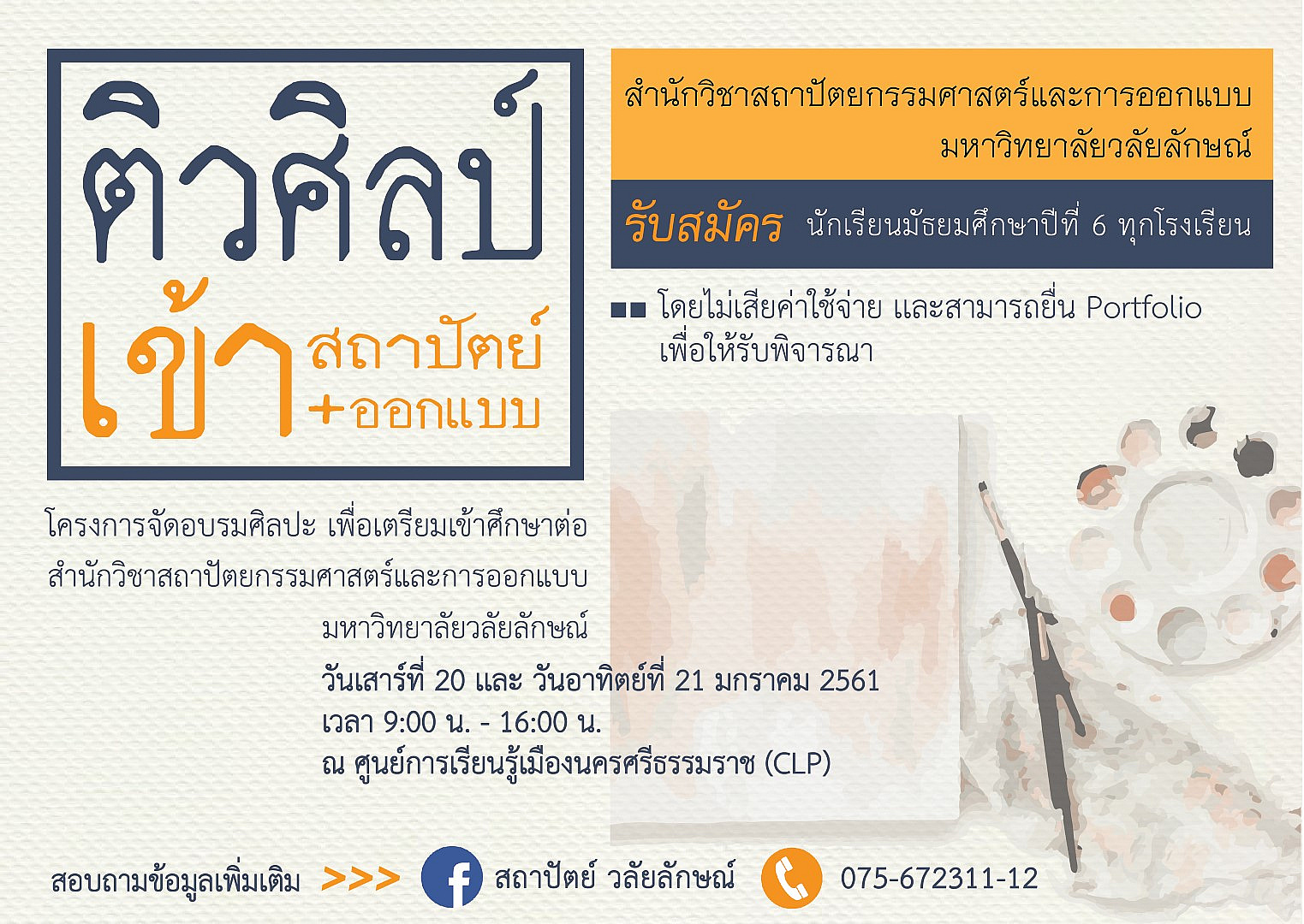 สำนักวิชาสถาปัตยกรรมศาสตร์และการออกแบบ ม.วลัยลักษณ์ จัดกิจกรรมติวศิลป์เข้าสถาปัตย์+ออกแบบ